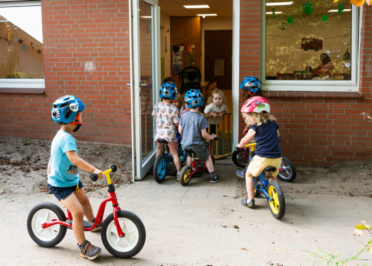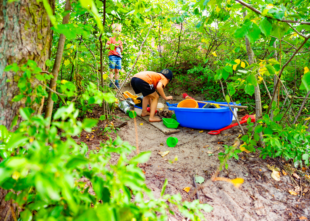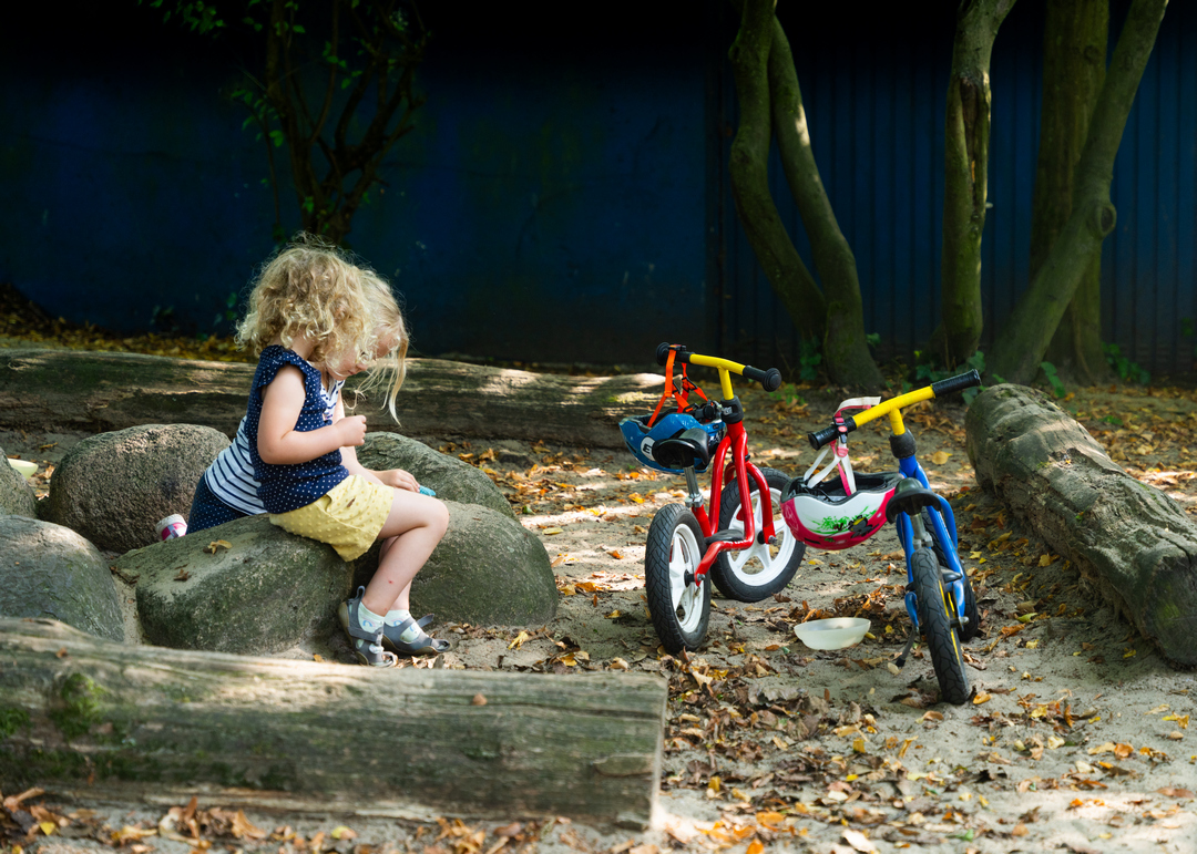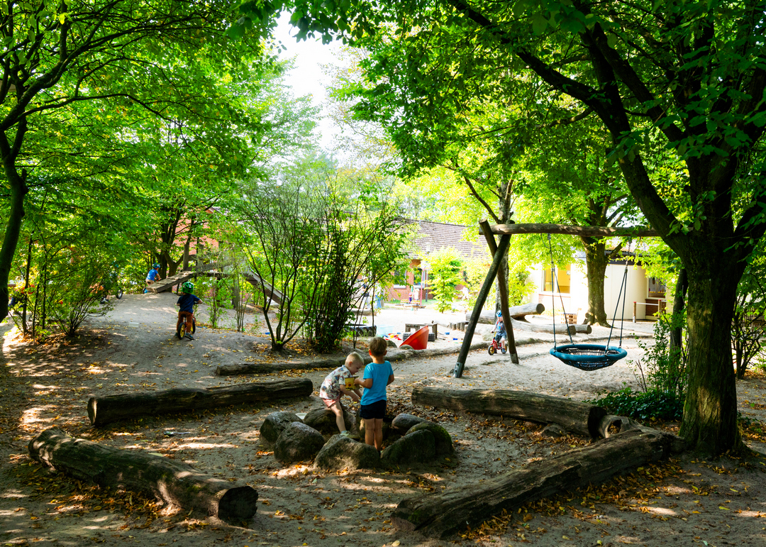 Es gibt Baumstämme und Erdhügel zum Klettern, sowie Wege mit befahrbarem Belag, einige kleine Rasen- und Sandflächen. Den Kindern stehen verschiedene Spielmöglichkeiten und Fahrzeuge zur